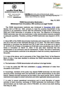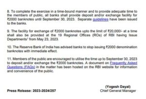 આરબીઆઈએ પ્રેસ રિલીઝમાં જણાવ્યું કે 2018-19માં જ 2000 રૂપિયાની નોટનું પ્રિન્ટિંગ બંધ કરી દેવામાં આવ્યું હતું. RBIએ કહ્યું કે તમે એક સમયે માત્ર 2 હજાર રૂપિયાની 20 હજાર રૂપિયા સુધીની નોટ બદલી શકો છો. આ માટે બેંકોએ ખાસ વિન્ડો ખોલવી પડશે. નવેમ્બર 2016માં નોટબંધી બાદ 2000 હજાર રૂપિયાની નોટ રજૂ કરવામાં આવી હતી. નોટબંધી દરમિયાન 500 અને 1000 રૂપિયાની નોટો પર પ્રતિબંધ મૂકવામાં આવ્યો હતો