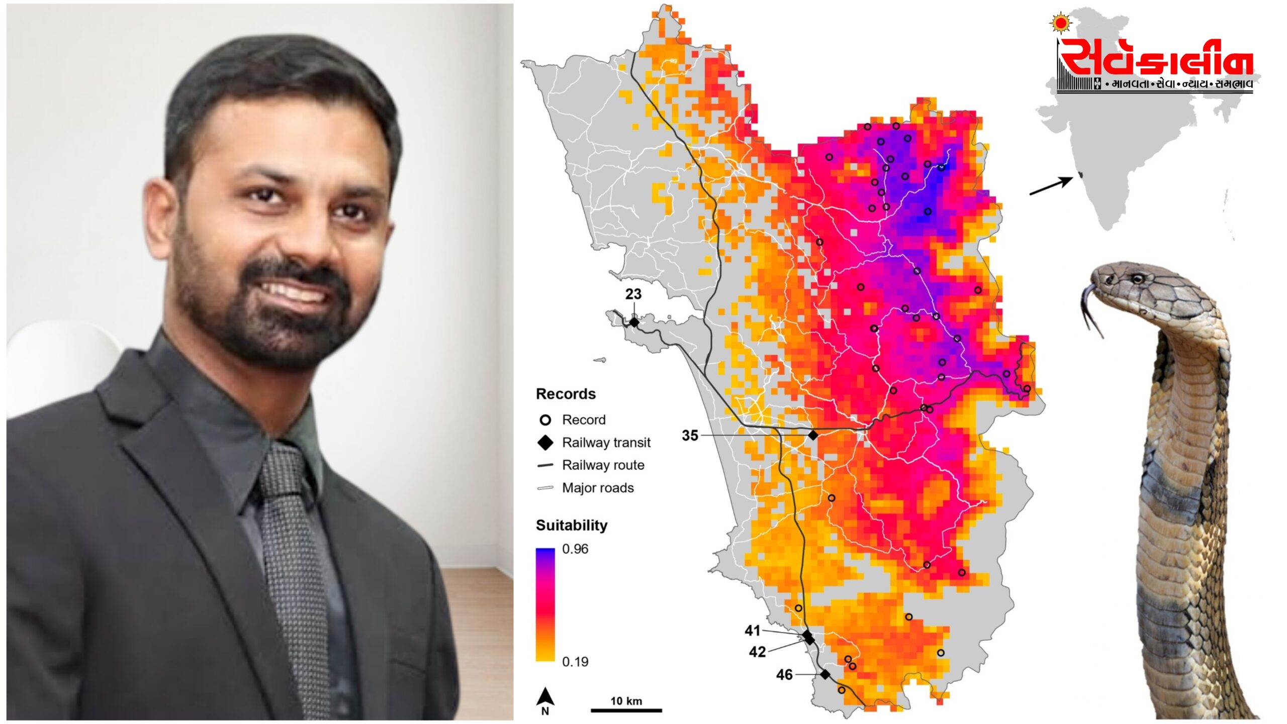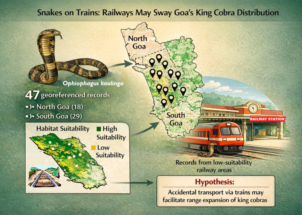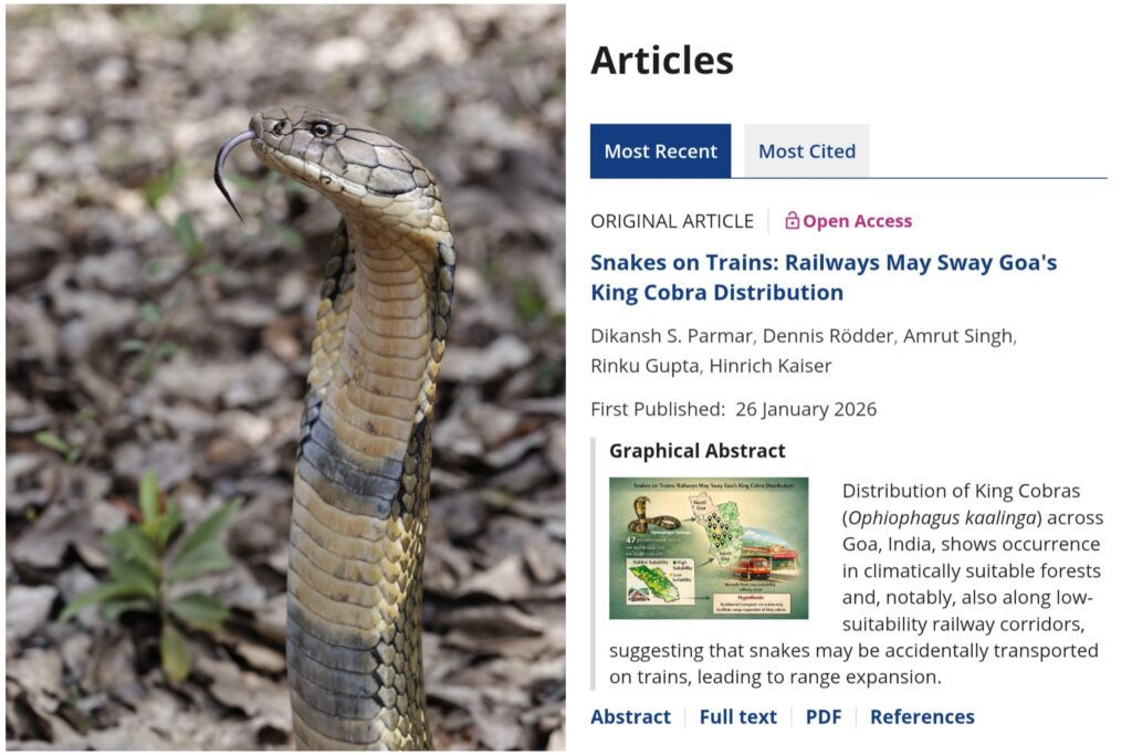 સુરત સ્થિત હર્પેટોલોજિસ્ટ દિકાંશ એસ. પરમાર અને આંતરરાષ્ટ્રીય સંશોધક ટીમે ગોવામાં કિંગ કોબ્રા (Ophiophagus kaalinga/ઓફીઓફેગસ કાલિંગા) ના 47 પુષ્ટિ થયેલા વિસ્તારોનું મેપિંગ કર્યું છે. આશ્ચર્યજનક રીતે, આમાંથી ઘણા સ્થળો રેલવે કોરિડોર અને સ્ટેશનોની આસપાસ આવેલા છે.જે જંગલમાં રહેતા ટોચના શિકારી સાપ માટે સંપૂર્ણપણે અયોગ્ય માનવામાં આવે છે.આ સંશોધન 26 જાન્યુઆરીના રોજ પ્રતિષ્ઠિત વૈજ્ઞાનિક જર્નલ બાયોટ્રોપિકા માં પ્રકાશિત થયું છે.